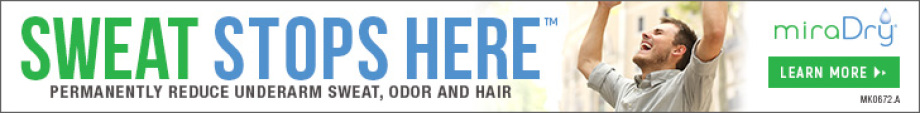 1. Li et al. Antigen expression of human eccrine sweat glands. J Cutan Pathol 36: 318-324 (2009). Lupin et al. Long-term efficacy and quality of life assessment for treatment of axillary hyperhidrosis with a microwave device. Dermatol Surg 40: 805-807 (2014). 2. Data on file, miraDry, Inc. 3. Hong et al. Clinical Evaluation of a Microwave Device for Treating Axillary Hyperhidrosis. Dermatol Surg 38:728-735 (2012). Patient results and experience may vary. The miraDry system is FDA-cleared for the treatment of unwanted underarm sweat and odor, as well as the permanent removal of unwanted underarm hair. Outside the U.S., the miraDry system is intended for use by health care professionals for treatment of primary axillary hyperhidrosis in adults. miraDry® and The Sweat Stops Here™ are trademarks of miraDry, Inc.
